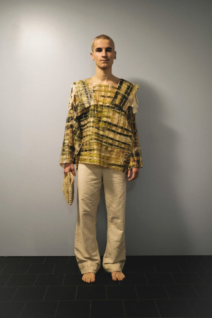 C’est dans cette démarche quelque peu baroque que nous avions demandé à des étudiants en design de repenser l’habit, la matière et la mode, autour du verset biblique : « Un temps pour naître, et un temps pour mourir ». Par souci de transparence, avouons-le : la commande est un peu déraisonnable. Quelle ne fut pas notre surprise lorsque nous découvrîmes ce tissage de charme principalement composé de poireaux.