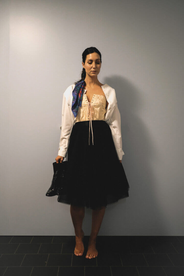 C’est sous la main habile de Laura, créatrice-chemisière de la marque Capsule en Coton, que se dessine une tenue aux allures de danse. Le tulle noir du deuil dévoile la frivolité timide d’un corset glané dans les tiroirs d’Astride. Le regard songeur de Marine surplombe en toute tendresse une invitation à danser sous nos larmes. Celles qui tempèrent nos chagrins et exultent nos liesses, accompagnées de quelques mots chuchotés comme un demi serment : « Ceux qui sèment dans les larmes récoltent avec des chants de joie ».