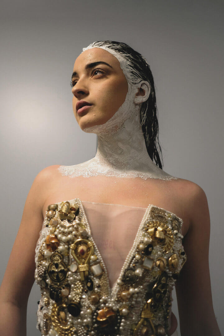 Le corset a été confectionné par Déborah, avec l’aide patiente de plusieurs mains maternelles, à partir de différentes pièces chinées dans les marchés et les greniers. Son aspect irrégulier et aléatoire cache néanmoins certaines symétries, dont la perspective nécessite une prise de hauteur. À l’image de la cadence d’aspect excessif et déséquilibré de l’industrie du vêtement, cette pièce est un appel discret à l’espoir. La marche lente que l’on appelle Histoire réserve parfois au destin et à la chance des embuscades salutaires. Elles prennent parfois l’aspect de pierres qui n’ont ni beauté ni splendeur propres à attirer nos regards.