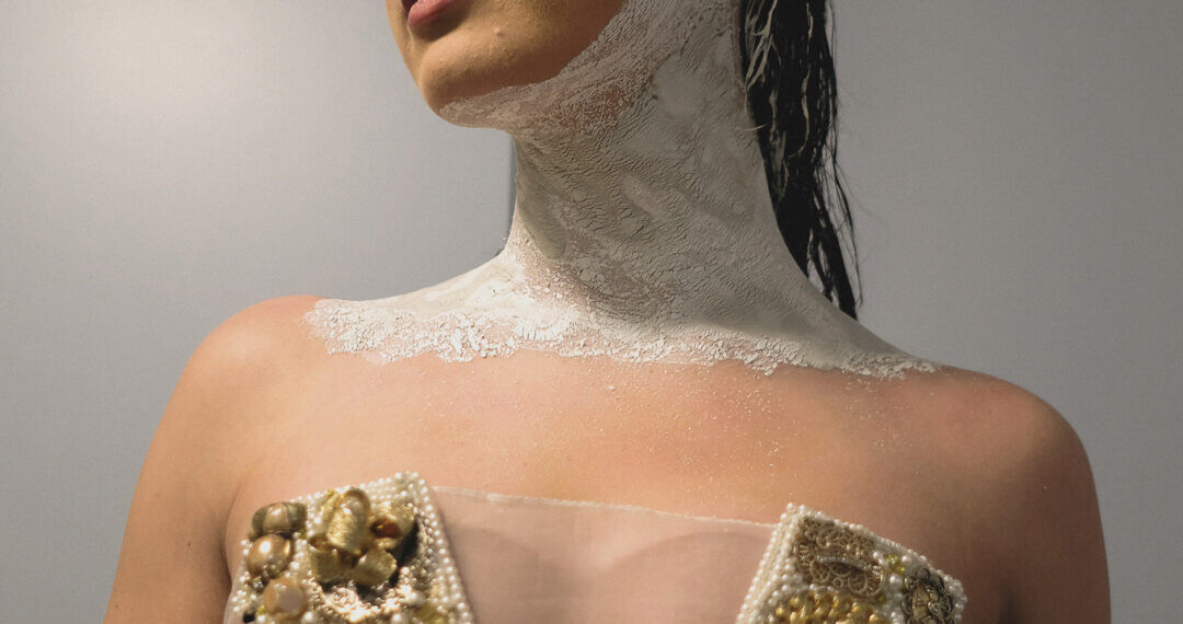 Le corset a été confectionné par Déborah, avec l’aide patiente de plusieurs mains maternelles, à partir de différentes pièces chinées dans les marchés et les greniers. Son aspect irrégulier et aléatoire cache néanmoins certaines symétries, dont la perspective nécessite une prise de hauteur. À l’image de la cadence d’aspect excessif et déséquilibré de l’industrie du vêtement, cette pièce est un appel discret à l’espoir. La marche lente que l’on appelle Histoire réserve parfois au destin et à la chance des embuscades salutaires. Elles prennent parfois l’aspect de pierres qui n’ont ni beauté ni splendeur propres à attirer nos regards.