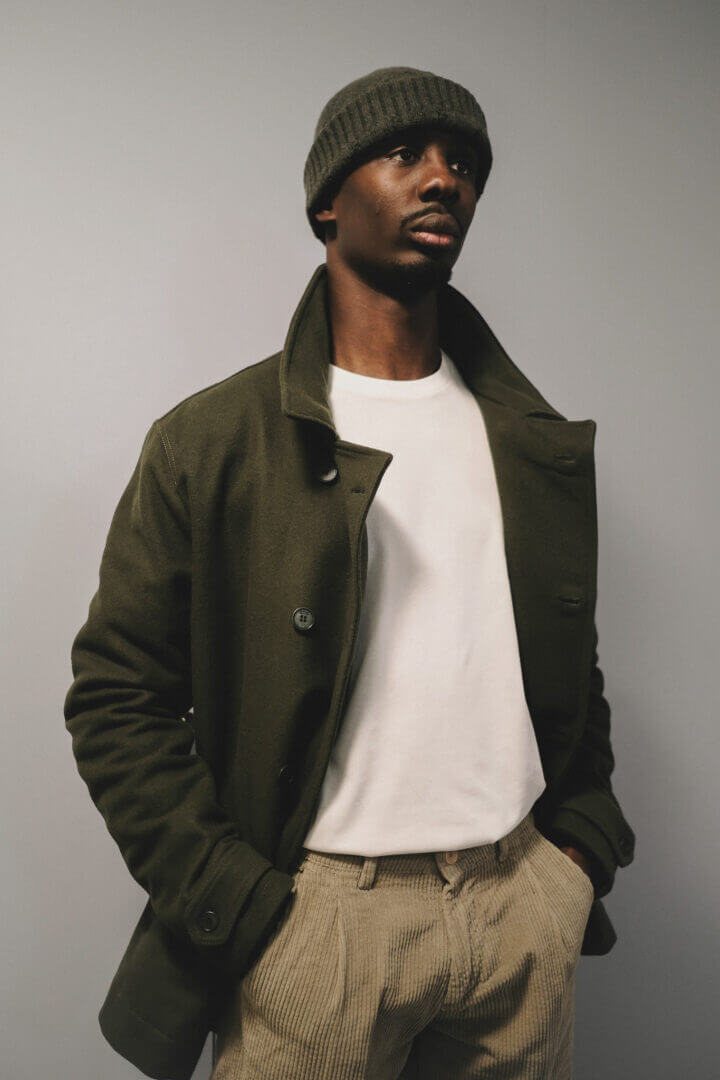 Ce look, constitué d’une veste kaki et d’un chino en velours côtelé vert pâle, nous a été prêté par Benjamin, fondateur de Clother, l’une des rares plateformes de vente de prêt-à-porter éthique en Suisse. A l’origine de la veste portée par David, qui tient le rôle central de cet ensemble : Rifò. Cette marque italienne soigneusement sélectionnée par Clother s’est nommée d’après le terme « refaire » pour illustrer sa démarche. Elle fait référence aux artisans toscans, connus sous le nom de « Cenciaioli », qui ont inventé il y a plus de cent ans une méthode de recyclage des vieux vêtements. Rifò incarne la revitalisation de cet artisanat traditionnel, tout en utilisant des techniques industrialisées pour le tri et la récupération des matières recyclées.