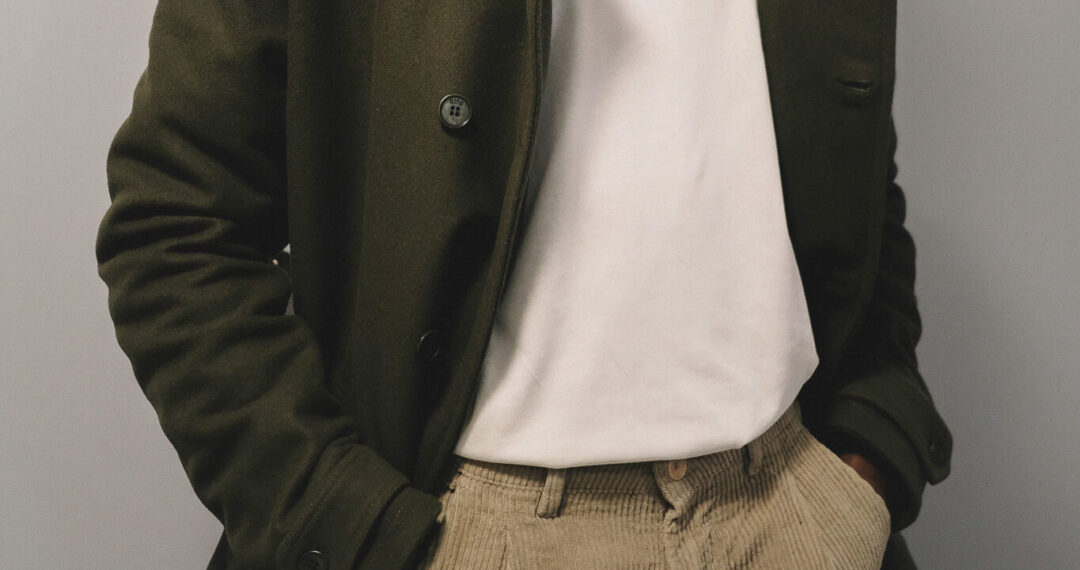 Ce look, constitué d’une veste kaki et d’un chino en velours côtelé vert pâle, nous a été prêté par Benjamin, fondateur de Clother, l’une des rares plateformes de vente de prêt-à-porter éthique en Suisse. A l’origine de la veste portée par David, qui tient le rôle central de cet ensemble : Rifò. Cette marque italienne soigneusement sélectionnée par Clother s’est nommée d’après le terme « refaire » pour illustrer sa démarche. Elle fait référence aux artisans toscans, connus sous le nom de « Cenciaioli », qui ont inventé il y a plus de cent ans une méthode de recyclage des vieux vêtements. Rifò incarne la revitalisation de cet artisanat traditionnel, tout en utilisant des techniques industrialisées pour le tri et la récupération des matières recyclées.